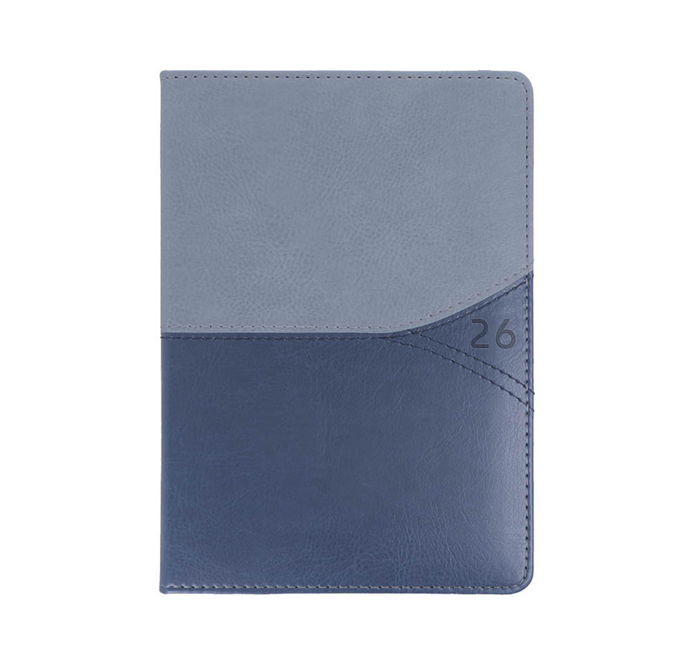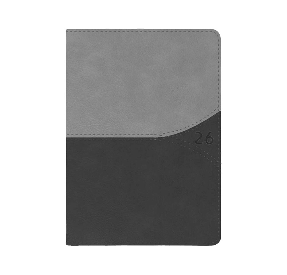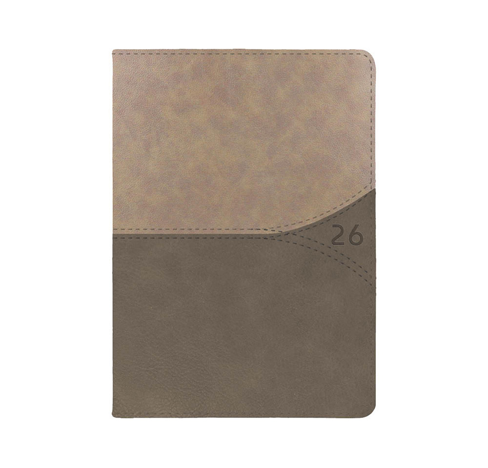 Blok terminarza szyty nićmi, z perforowanymi zaokrąglonymi narożnikami i wyciętymi registrami (poza A6). Tasiemka i kapitałka kremowe.