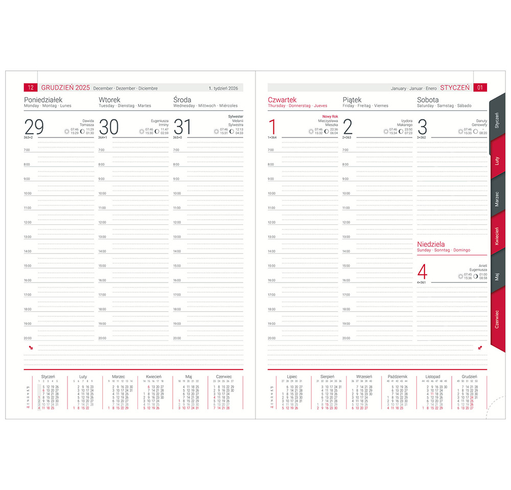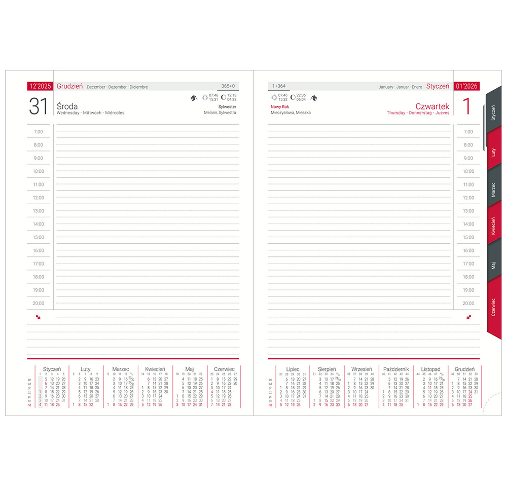 DOSTĘPNE FORMATY: A4 dzienny z registrami, A4 tygodniowy z registrami, A6 tygodniowy, A5 dzienny z registrami, B5 dzienny z registrami.