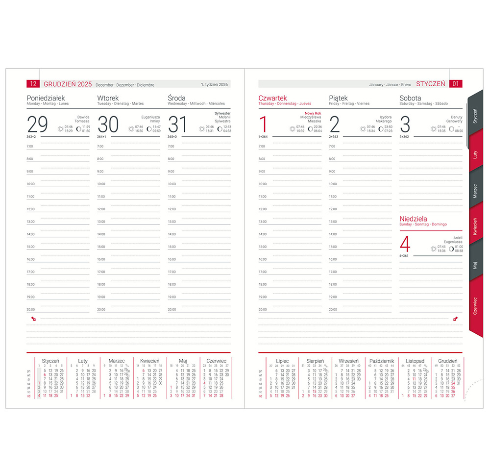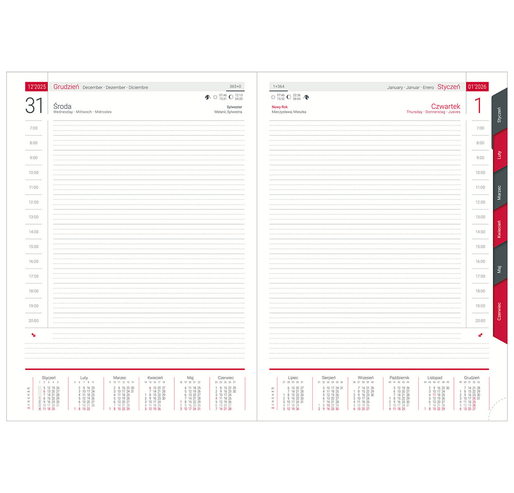 DOSTĘPNE FORMATY: A4 dzienny z registrami, B5 tygodniowy z registrami, A5 dzienny z registrami.
