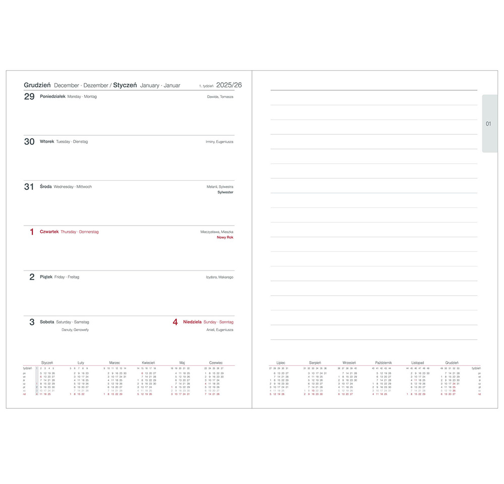 W układzie dziennym lub tygodniowo-notesowy, drukowany na białym papierze.